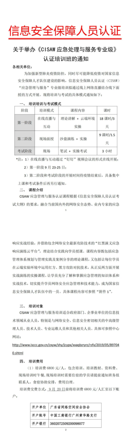 通知 | 关于举办《CISAW 应急处理与服务专业级》 认证培训班的通知(9月档)
