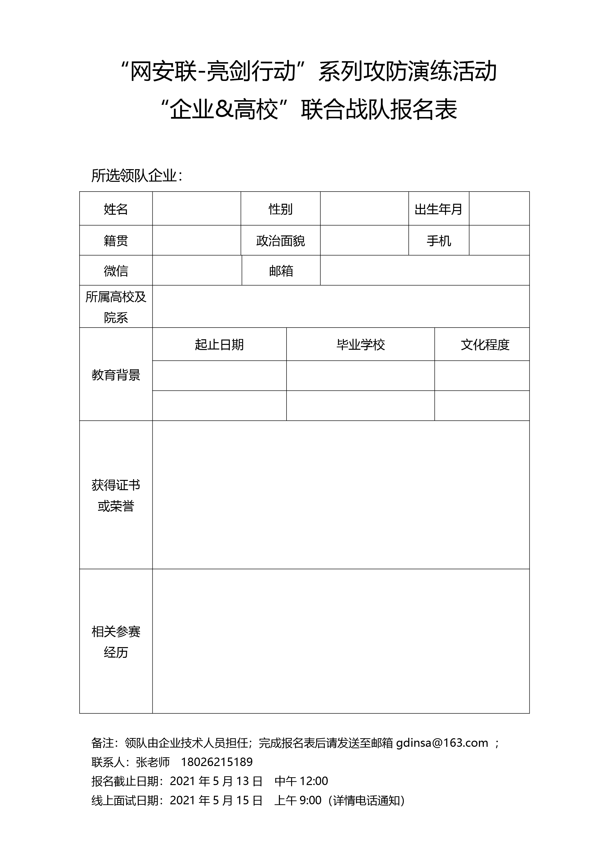 “网安联-亮剑行动”系列攻防演练活动 “企业&高校”联合战队报名表